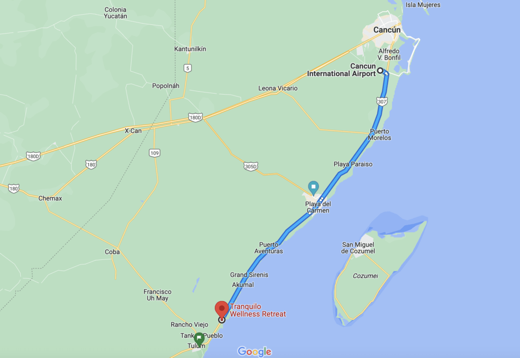 - Drive From Cancun Airport. Get on Cancun – Chetumal/Carr. Tulum – Cancún/México 307 from Carr. a Aeropuerto Cancún 4 min (3.0 km) Follow Cancun – Chetumal/Carr. Tulum – Cancún/México 307 1 hr 10 min (102 km)